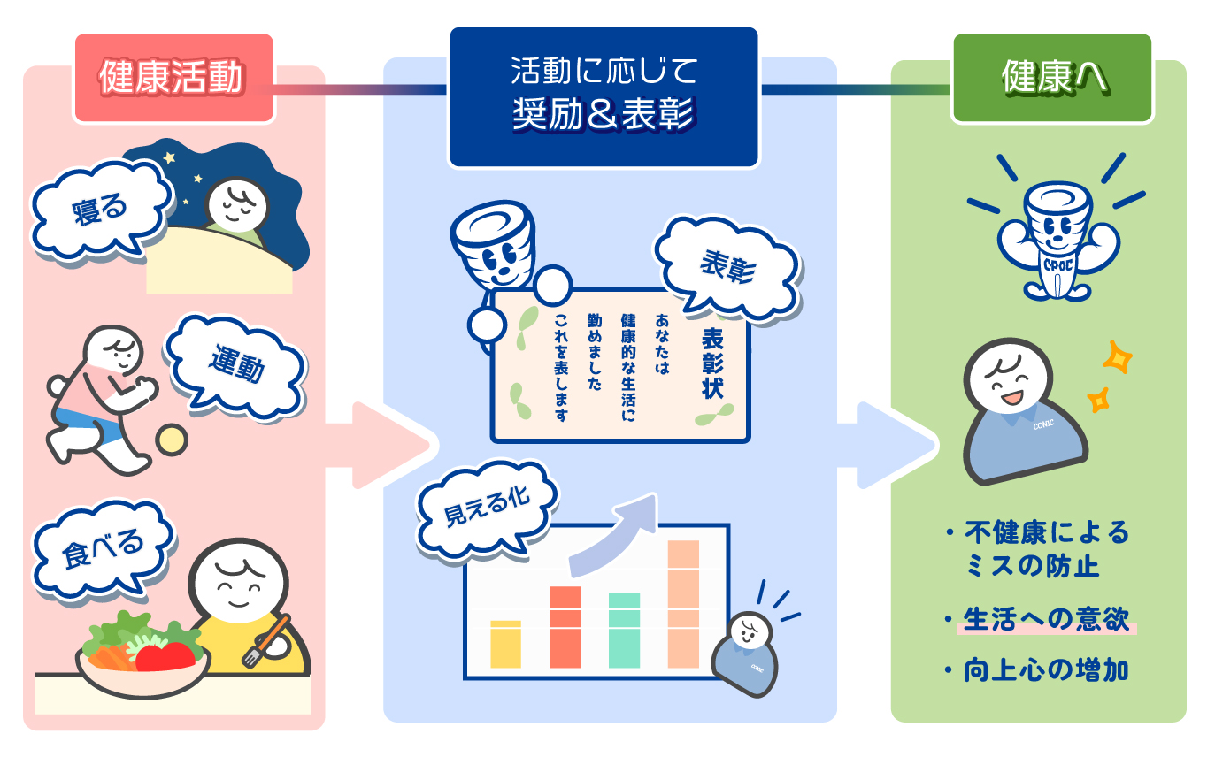 具体的には、社員一人ひとりが自発的に健康経営に参画し、自らの生活習慣の改善やパフォーマンス向上につながるプログラムを企画・実施しています。