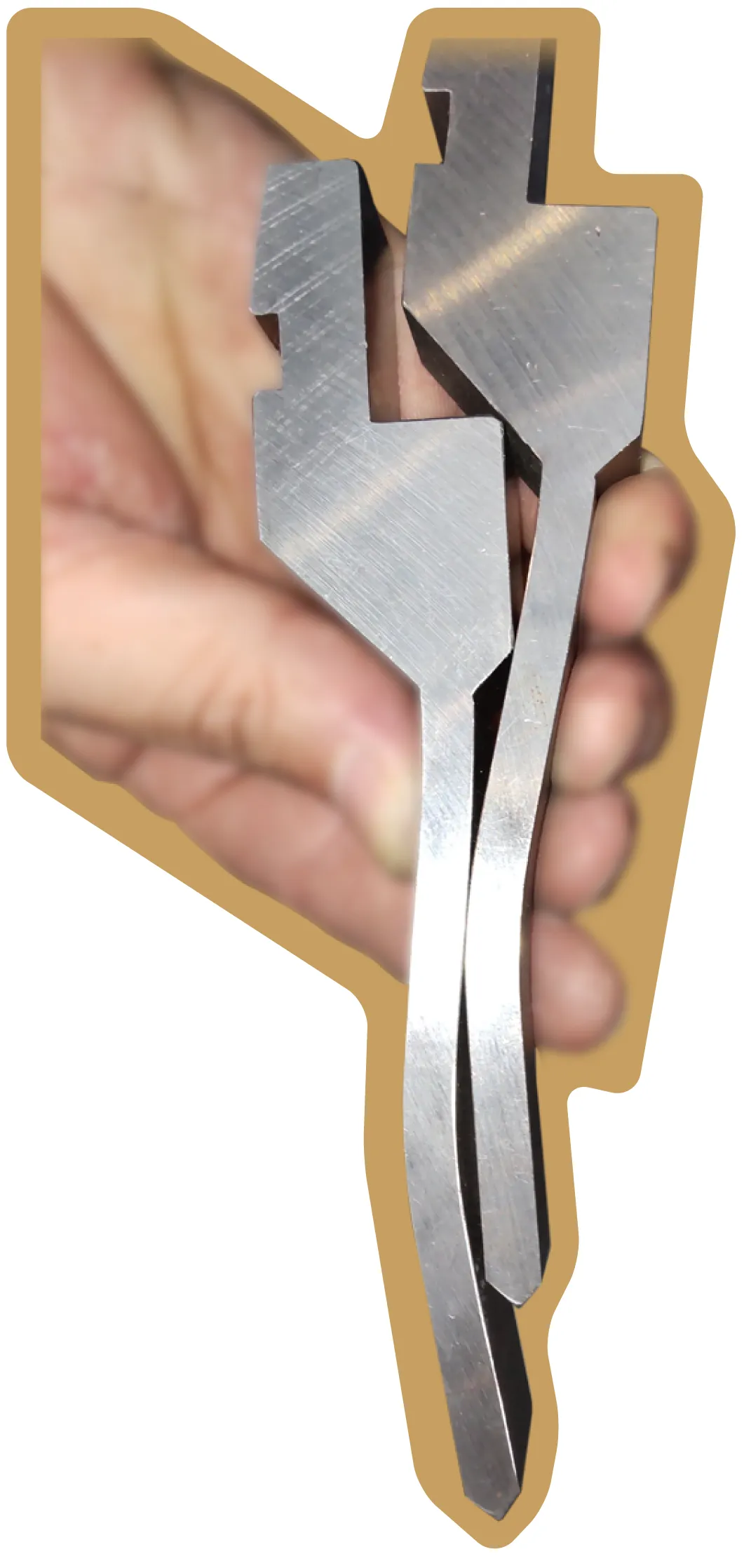 従来の金型は割れて飛散し、作業者がケガをするリスクがありましたが、当社の金型は刃先のみを高硬度化しました。