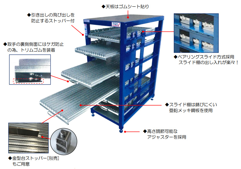 スライド棚には錆びにくい亜鉛メッキ鋼板を使用し、長期間の使用でも劣化を抑えます。