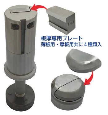 金型交換と聞くと「手間がかかる」と思われがちですが、本製品は板厚ごとに専用プレートを差し替えるだけ。